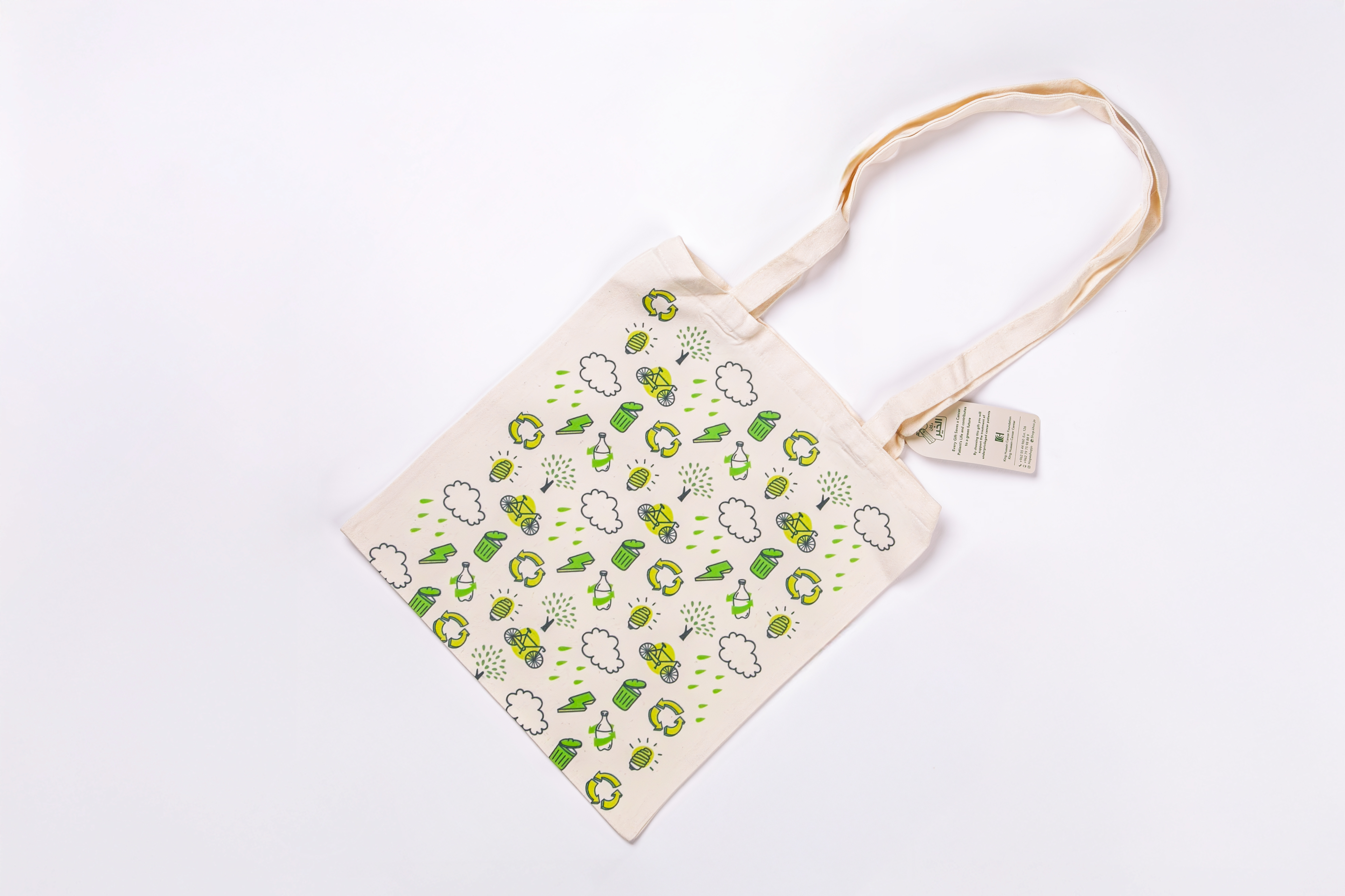 حقيبة قماشية تُحمل على الكتف مزينة برموز صديقة للبيئة "مصنوعة من مواد صديقة للبيئة لدعم مستقبل أخضر ومستدام"