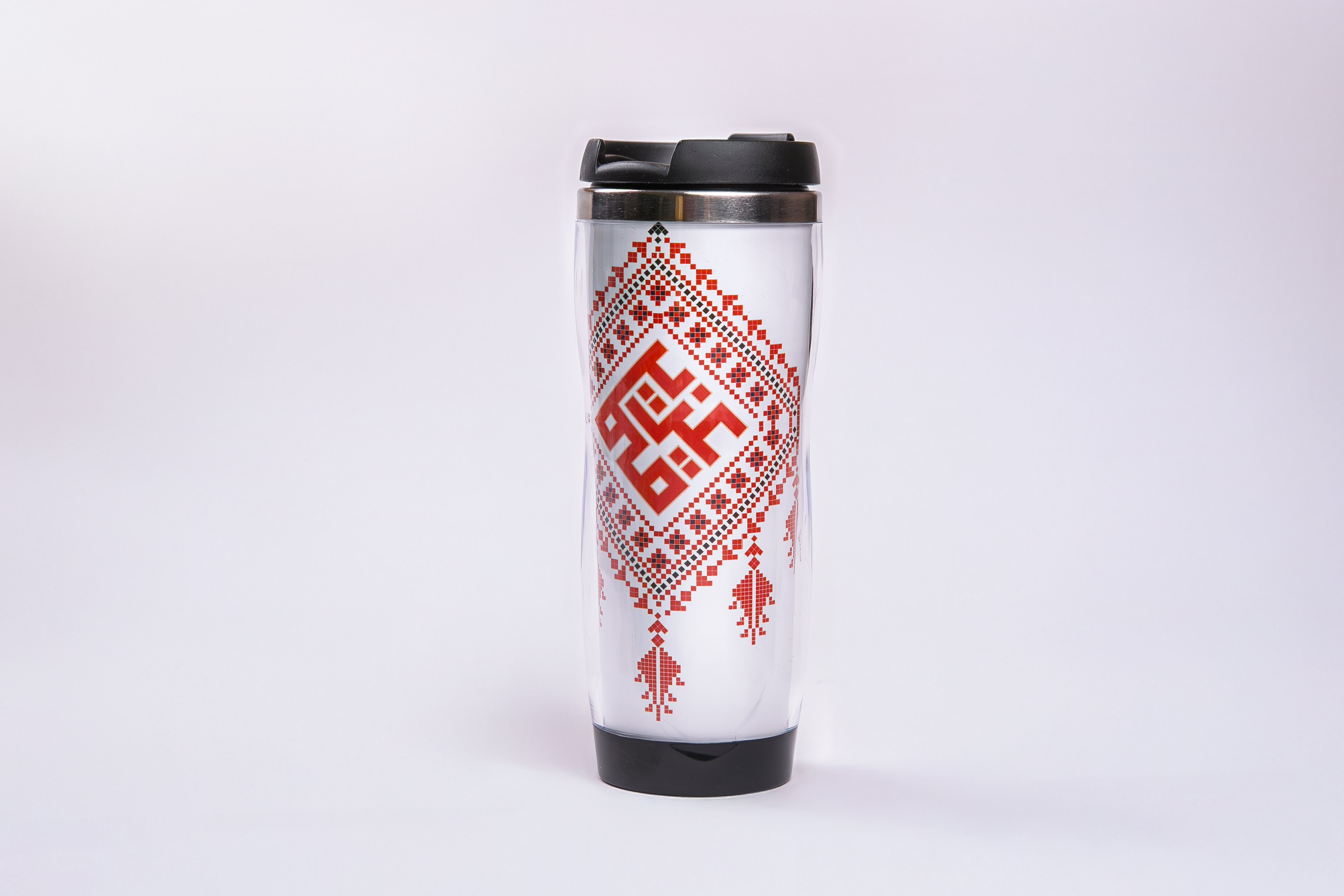كوب حراري باللون الأبيض مزين بالكوفية الأردنية باللون الأبيض والأحمر بكلمة عزيمة الحجم: 450 مل.